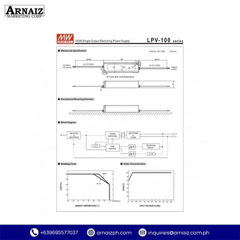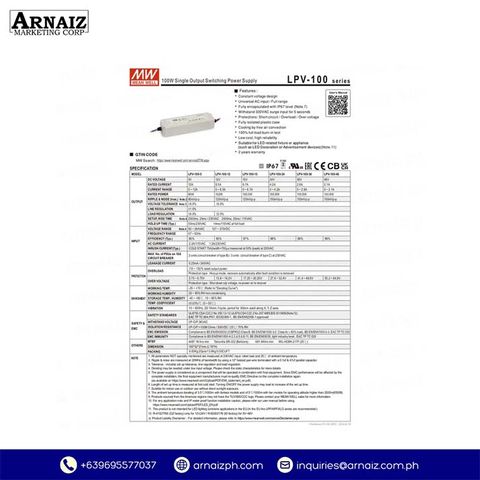 The LPV-100-12 is an AC-DC constant voltage LED driver that supplies a regulated 12V DC output with a power capacity of up to 102W. It features a fully enclosed plastic housing with IP67 protection, making it suitable for both indoor and outdoor LED installations. This non-dimmable power supply ensures dependable performance with built-in safety protections.